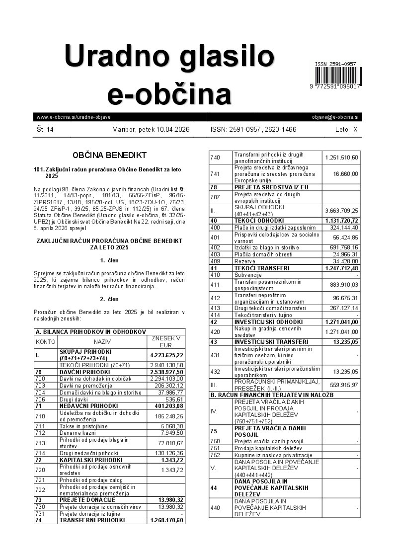Zaključni račun proračuna Občine Benedikt za leto 2025