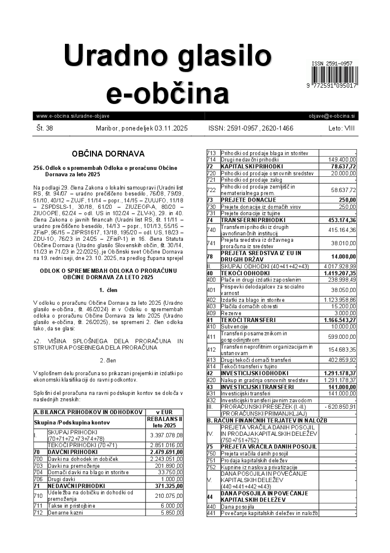 Odlok o spremembah Odloka o proračunu Občine Dornava za leto 2025